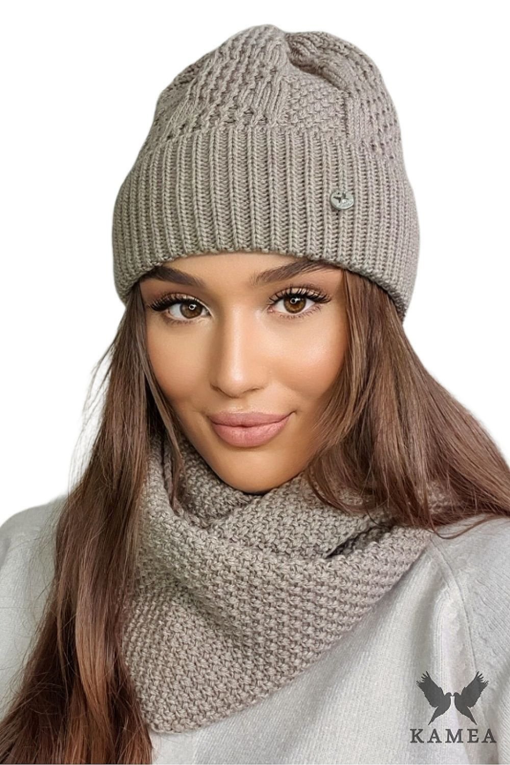 SAFONA women's set is a great proposal for autumn and winter. The products are characterized by beautiful shapes and thick weaves, making them not only stylish but also warm and comfortable to wear. The hat with a wide cuff over the forehead and the cowl in a uniform dark beige color emphasize the charm of fantastic patterns, which highlight the play of light between them. The soft-touch hat and cowl provide warmth and comfort of use, and will easily match any type of styling. The set is perfect for autumn and winter, available in several color variants. KAMEA brand products guarantee the highest quality, so you can be sure that they will serve you for many seasons.