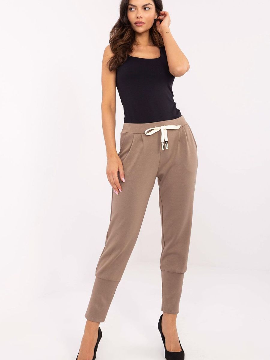 These fashionable sweatpants are a great option for women who value comfort and a versatile style. Made from a soft and pleasant-to-touch blend of viscose and elastane, the pants are comfortable to wear and fit well. The high waist highlights the waist and visually elongates the legs, while the wide cuffs at the bottom of the legs give the pants a sporty character and prevent them from rolling up. This is the ideal solution for women who appreciate comfort and functionality. The tie at the waist allows for a perfect fit to the silhouette, and the side slip pockets are practical for storing small items like a phone or keys. The universal cut and smooth design make the pants suitable for many outfits, both casual and sporty. You can wear them daily, for a walk, workouts, or a meeting with friends. These women's sweatpants are the perfect choice for women who value comfort, style, and functionality. They will be great for everyday activities as well as for relaxing at home.
