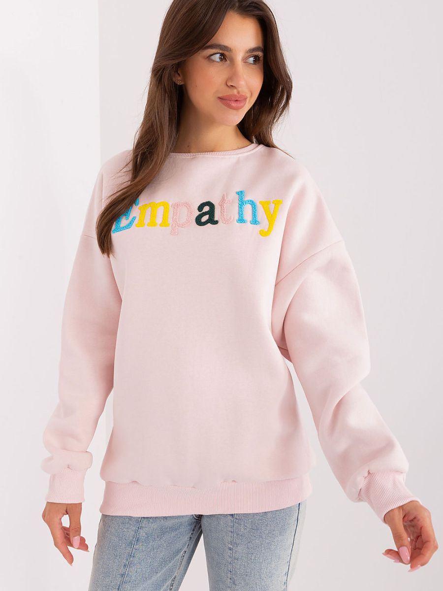 Women's sweatshirt pulled over the head is the perfect choice for fans of casual style. It stands out with a dominant pattern and a front inscription that gives it a unique character. The varied texture of the material adds an interesting, modern look. The sweatshirt made of a combination of cotton and polyester ensures comfort and durability. Standard length and long sleeves make it perfect for everyday wear. The round neckline emphasizes the classic, universal cut that fits any styling.
