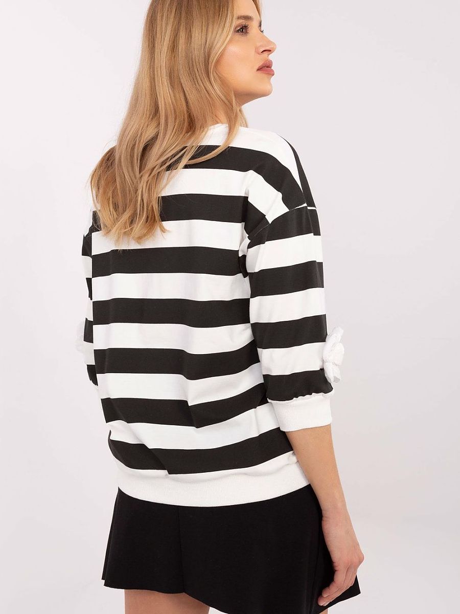 Casual blouse put on over the head, perfect for everyday wear and for work. Made of soft and breathable cotton with elastane, it provides comfort and freedom of movement. The model of standard length with 3/4 sleeves will work well in various stylings. The dominant pattern in wide stripes gives the blouse a fashionable and timeless character. An additional advantage are decorative flower-shaped patches placed on the sleeves, adding subtle elegance. An excellent choice for both jeans and more elegant trousers or a skirt.