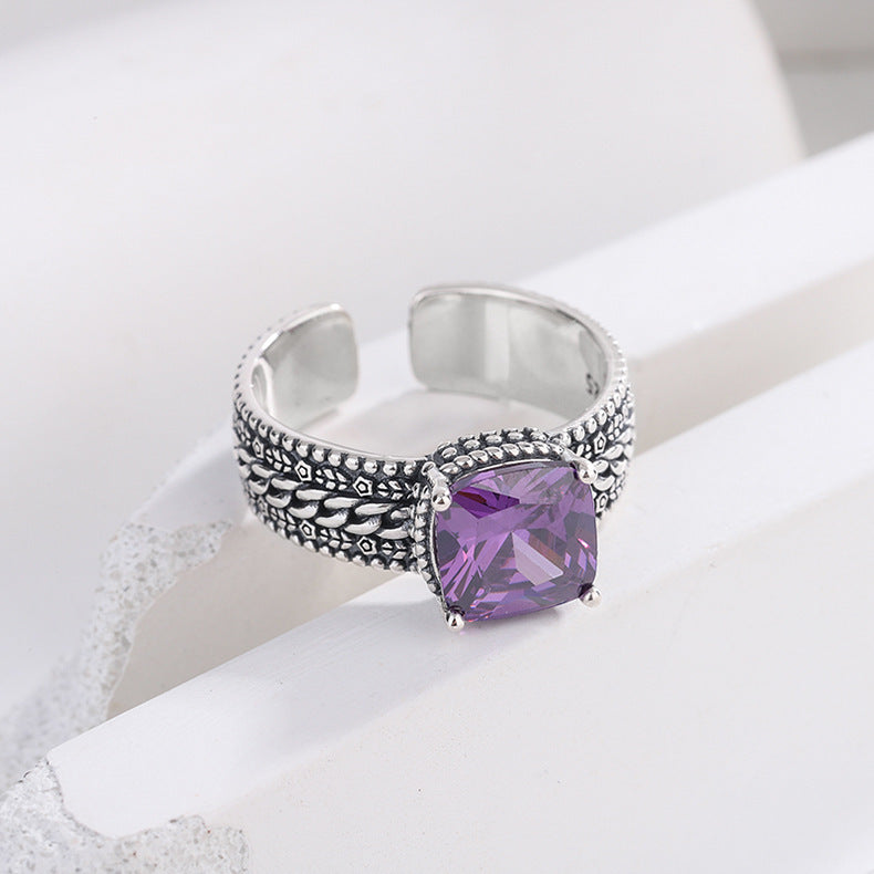S925 Sterling Silver Square Crystal Purple Simple Fried Dough Twist Temperament Heavy Industry Vintage Ring