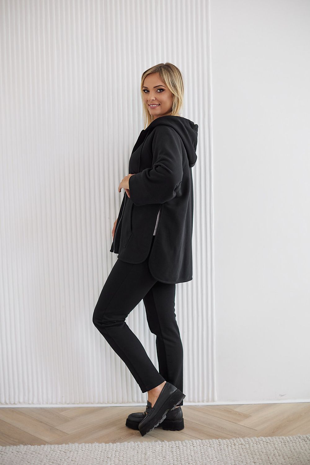 A hooded sweatshirt with an open design. Designed according to the principles of the brand, with mature women in mind. Thanks to its unique design, it is perfect for larger sizes. Excellent quality of workmanship and finishing, resulting primarily from the skills of the people who sewed it for you. The sweatshirt is made of certified 300gm2 cotton, additionally refined through an enzymatic and siliconizing process, giving it softness and a smooth structure. A stainless-steel metal zipper, decorative autolap stitching, and metal fittings complete the whole.