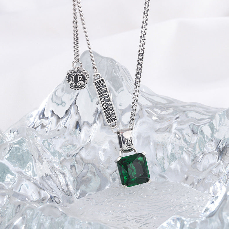 S925 Silver Emerald Necklace Women Retro Fashion Charm Crown Collar Chain Hip Hop Personality Sweater Chain