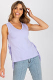 Sleeveless summer T-shirt with a heart neckline. Decorative tassels on the sides, back of the shirt extended.